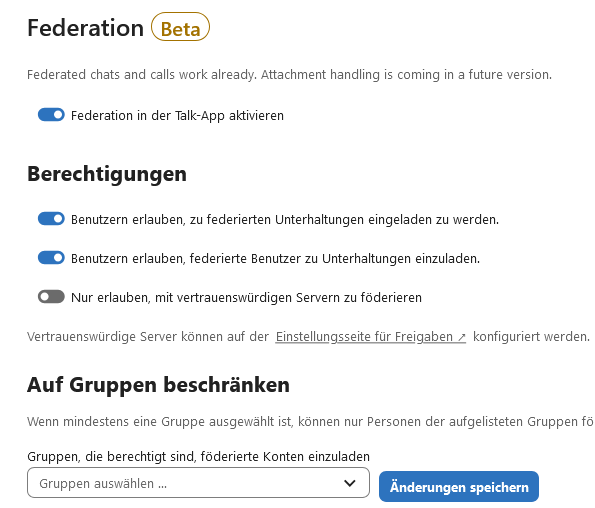 - In den Verwaltungseinstellungen/Talk muss die Federation aktiviert und erlaubt sein: